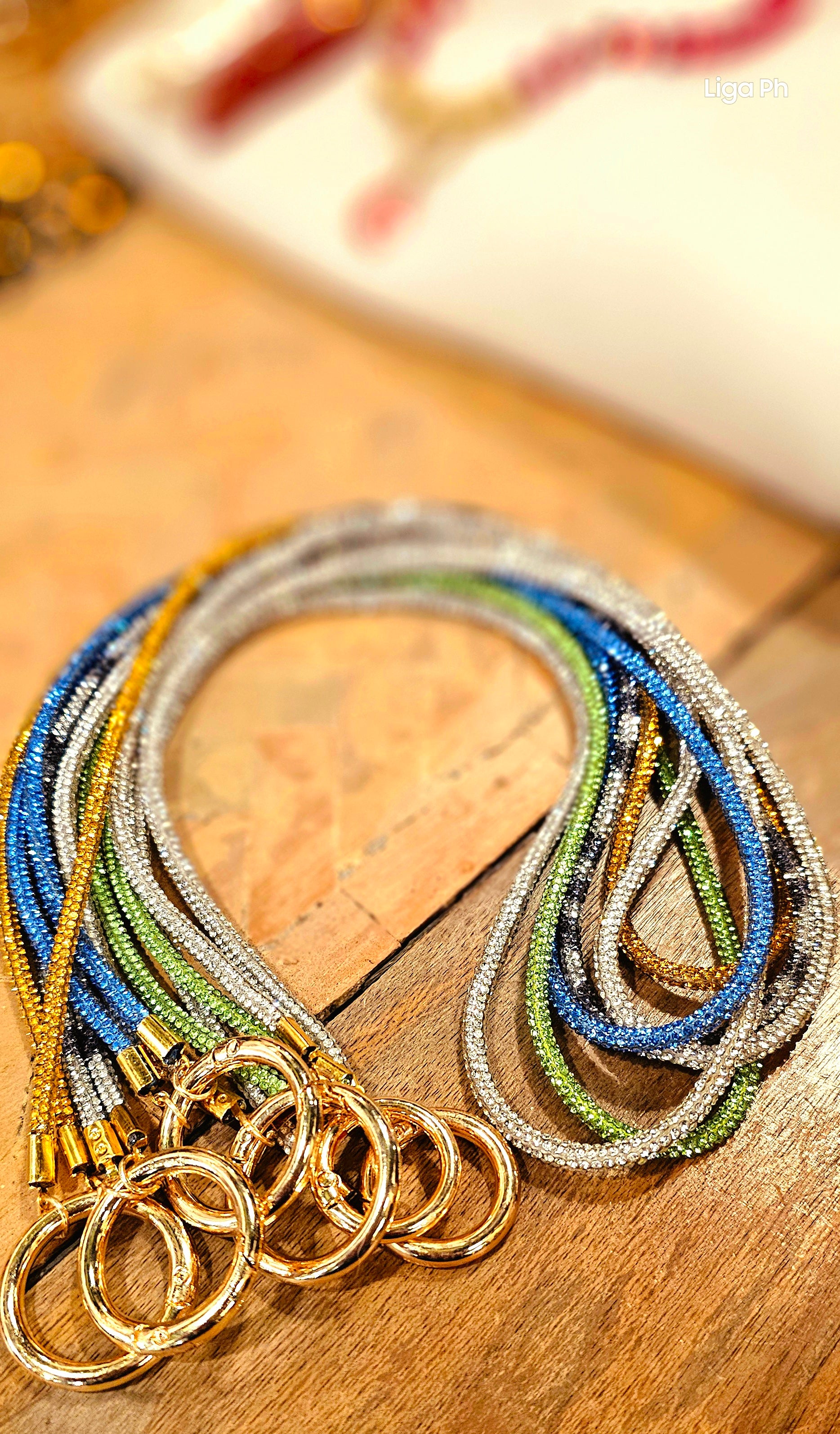 Laccio portaocchiali con strass luccicanti ed anello dorato.